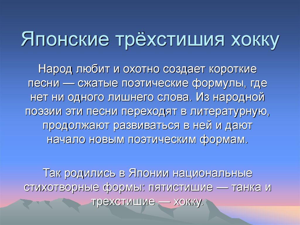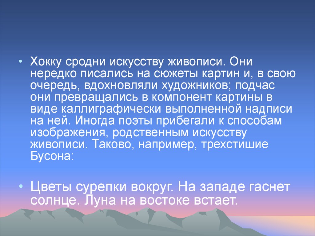 • Хокку сродни искусству живописи. Онинередко писались на сюжеты картин и, в свою
