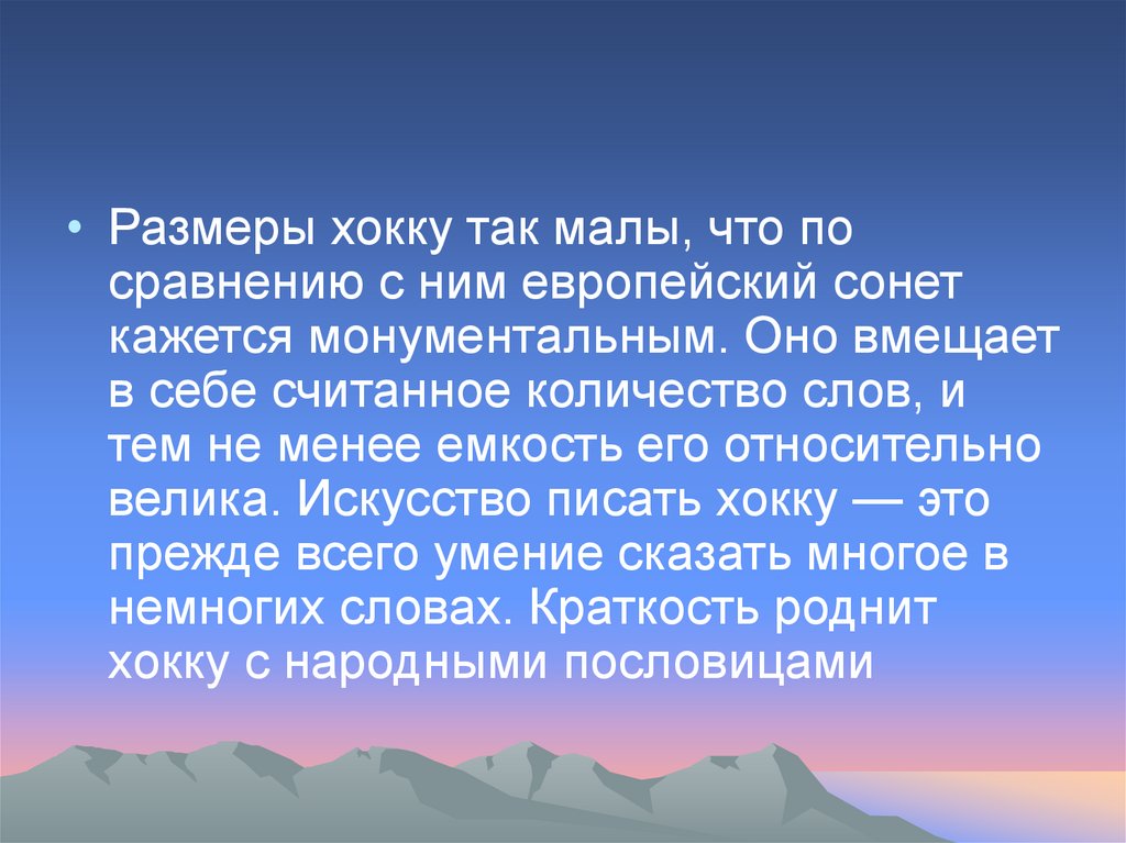 • Размеры хокку так малы, что посравнению с ним европейский сонет