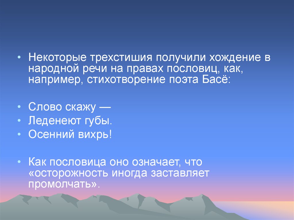 • Некоторые трехстишия получили хождение внародной речи на правах пословиц, как,