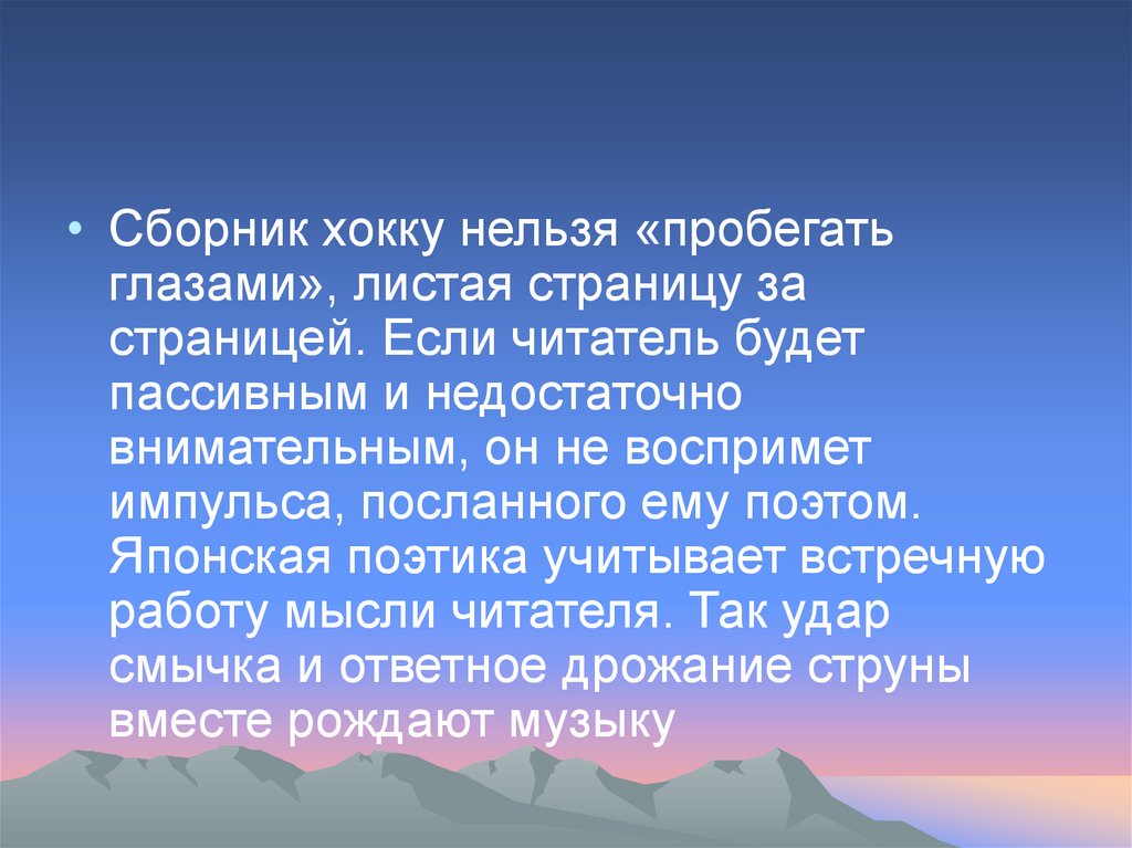 • Сборник хокку нельзя «пробегатьглазами», листая страницу за