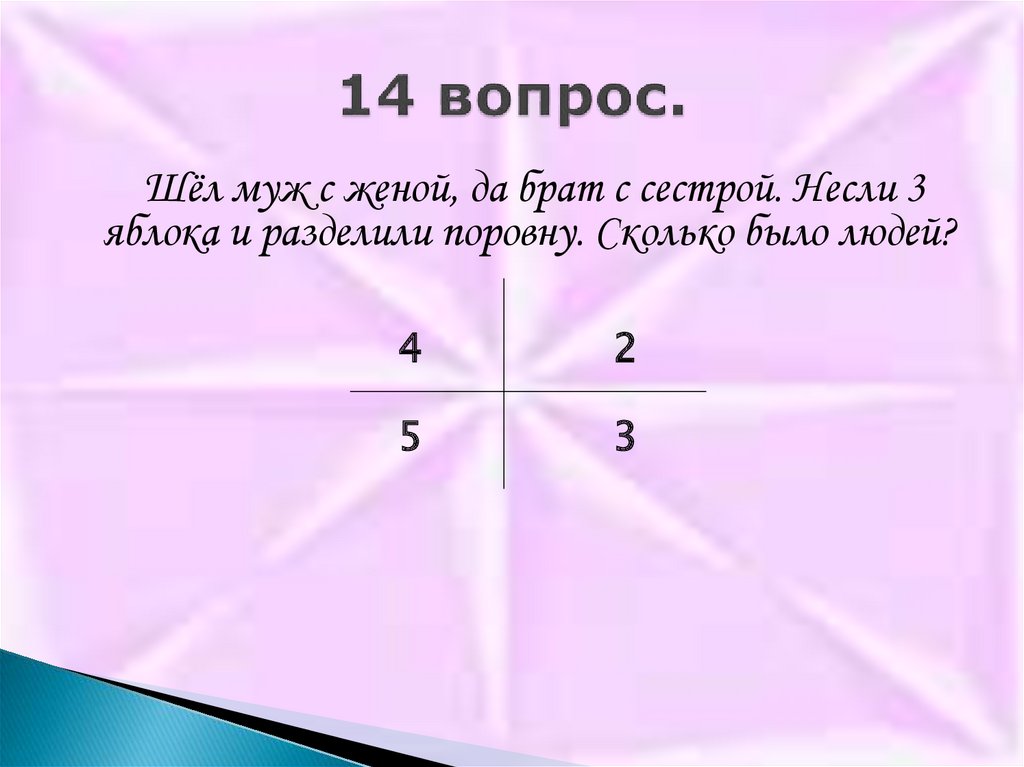 Шёл муж с женой, да брат с сестрой. Несли 3яблока и разделили поровну. Сколько было людей?
