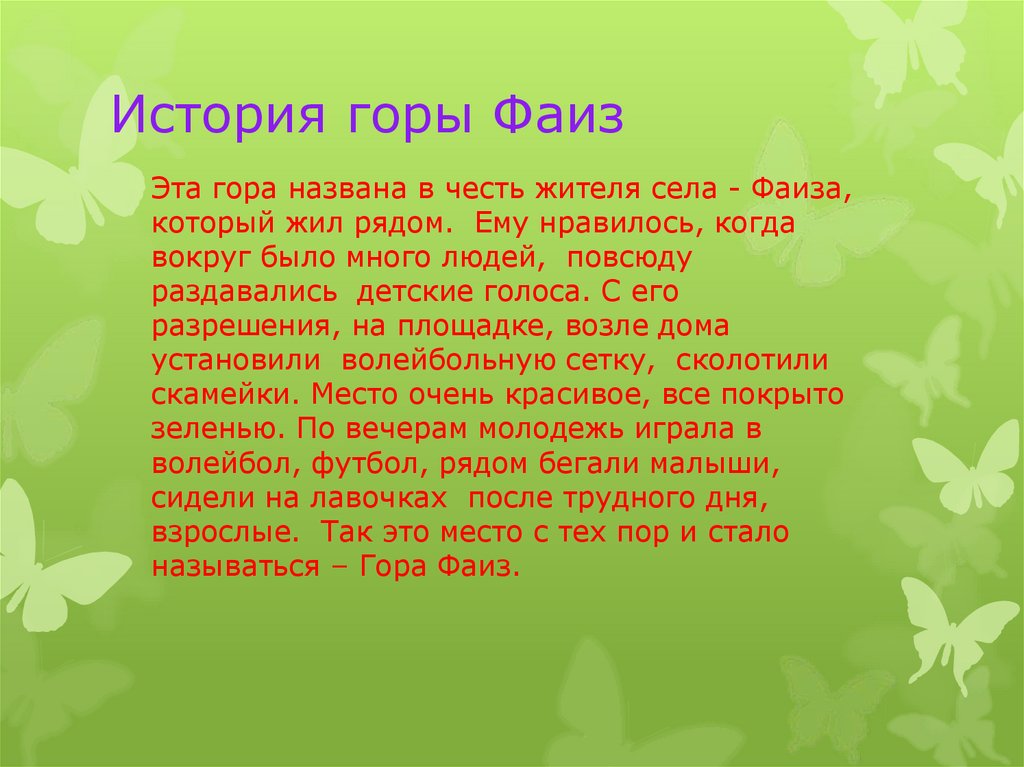 История горы ФаизЭта гора названа в честь жителя села - Фаиза,