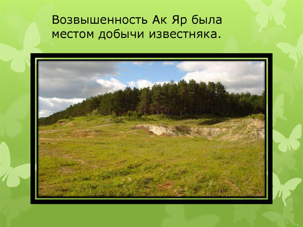 Возвышенность Ак Яр быламестом добычи известняка.