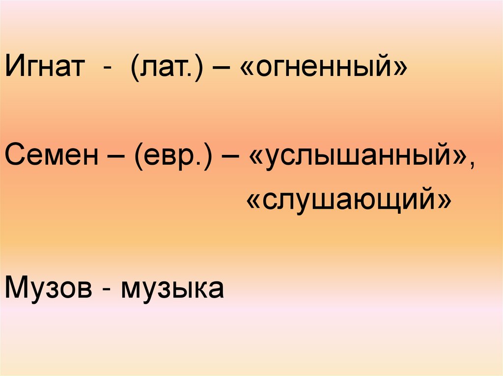 Игнат - (лат.) – «огненный»Семен – (евр.) – «услышанный»,