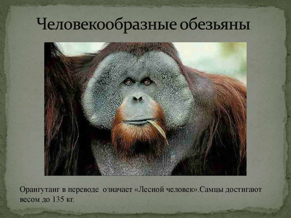 Орангутанг в переводе означает «Лесной человек».Самцы достигаютвесом до 135 кг.