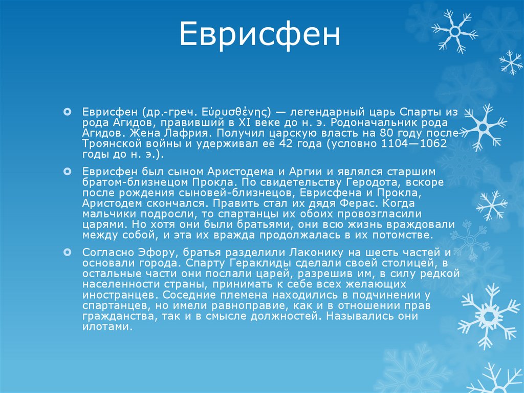 ЕврисфенЕврисфен (др.-греч. Εὐρυσθένης) — легендарный царь Спарты из