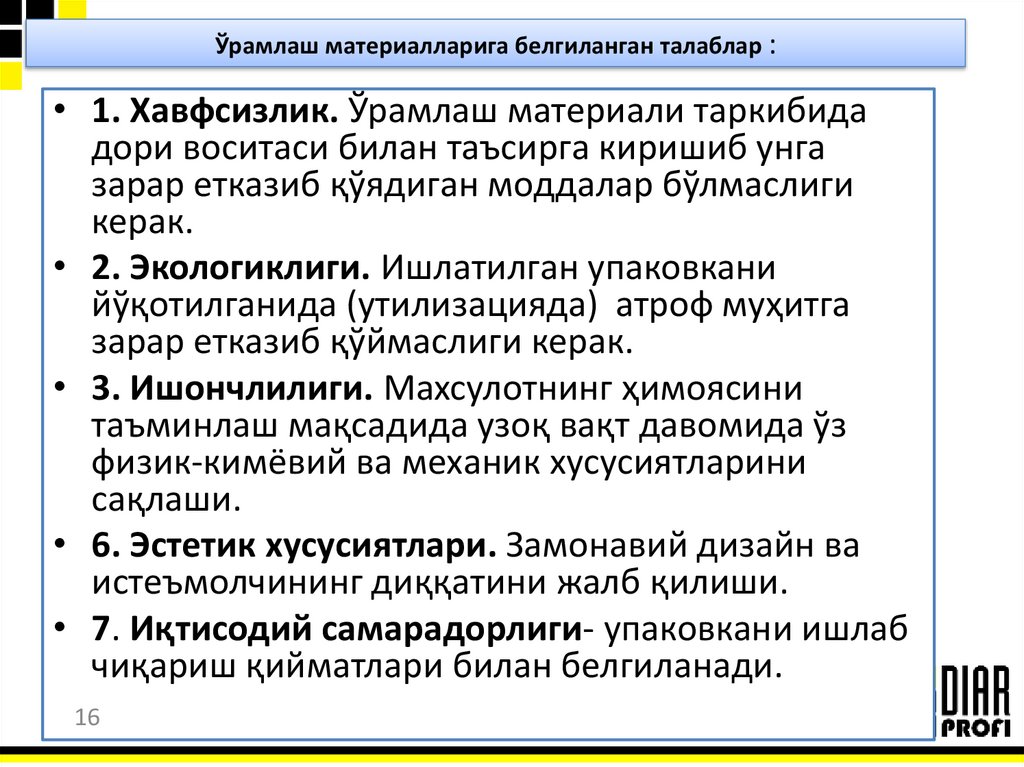 Ўрамлаш материалларига белгиланган талаблар :• 1. Хавфсизлик. Ўрамлаш материали таркибида