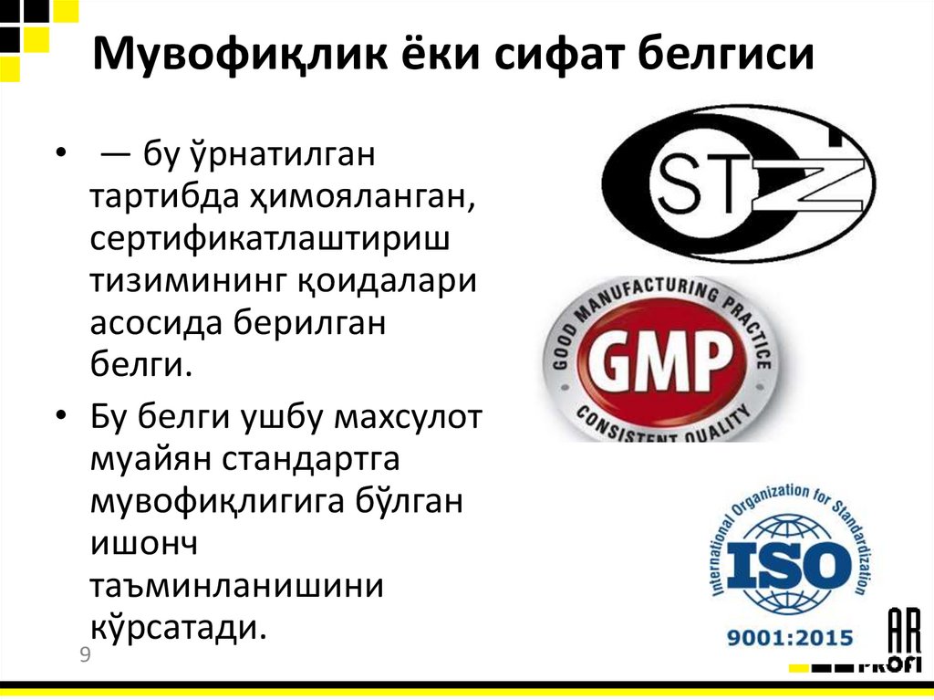 Мувофиқлик ёки сифат белгиси• — бу ўрнатилган