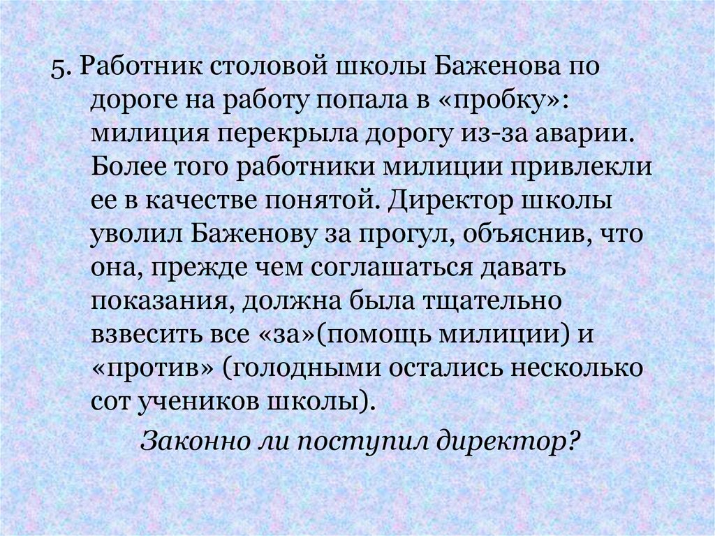 5. Работник столовой школы Баженова подороге на работу попала в «пробку»: