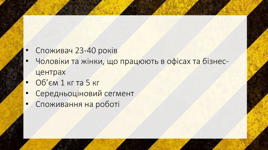• Споживач 23-40 років• Чоловіки та жінки, що працюють в офісах та бізнесцентрах