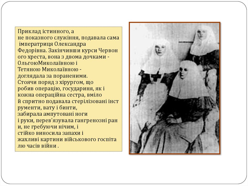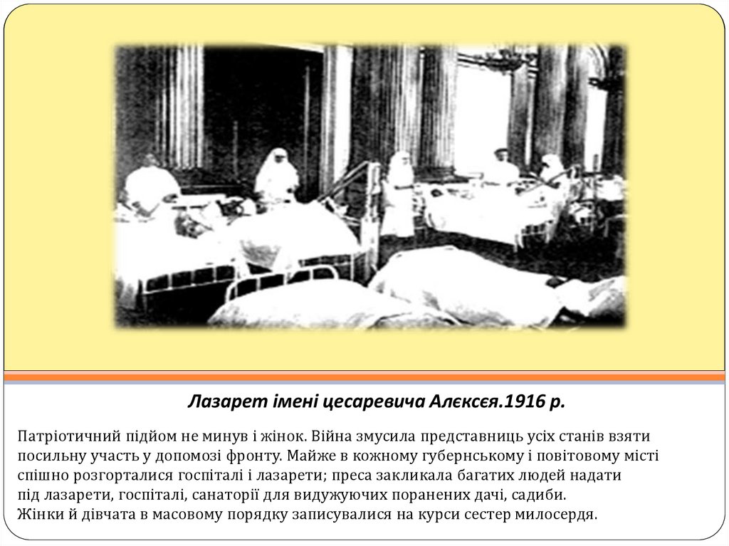 Лазарет імені цесаревича Алєксєя.1916 р.Патріотичний підйом не минув і жінок. Війна змусила представниць усіх станів взяти