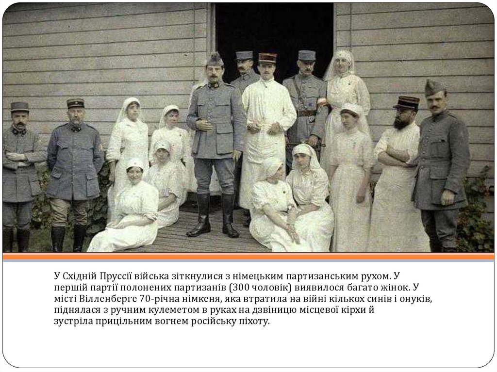 У Східній Пруссії війська зіткнулися з німецьким партизанським рухом. Упершій партії полонених партизанів (300 чоловік) виявилося багато жінок. У