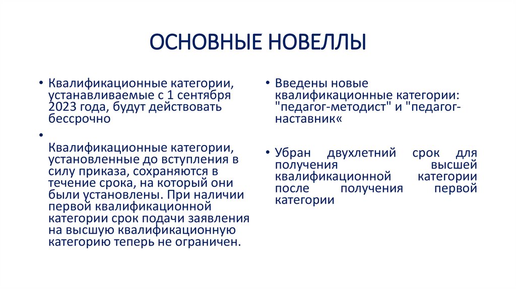 ОСНОВНЫЕ НОВЕЛЛЫ• Квалификационные категории,