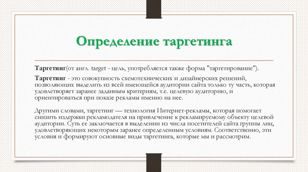 Определение таргетингаТаргетинг(от англ. target - цель, употребляется также форма "таргетирование").