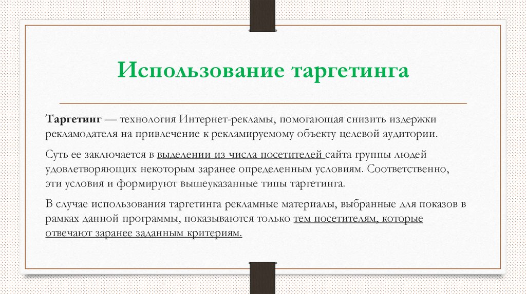 Использование таргетингаТаргетинг — технология Интернет-рекламы, помогающая снизить издержки