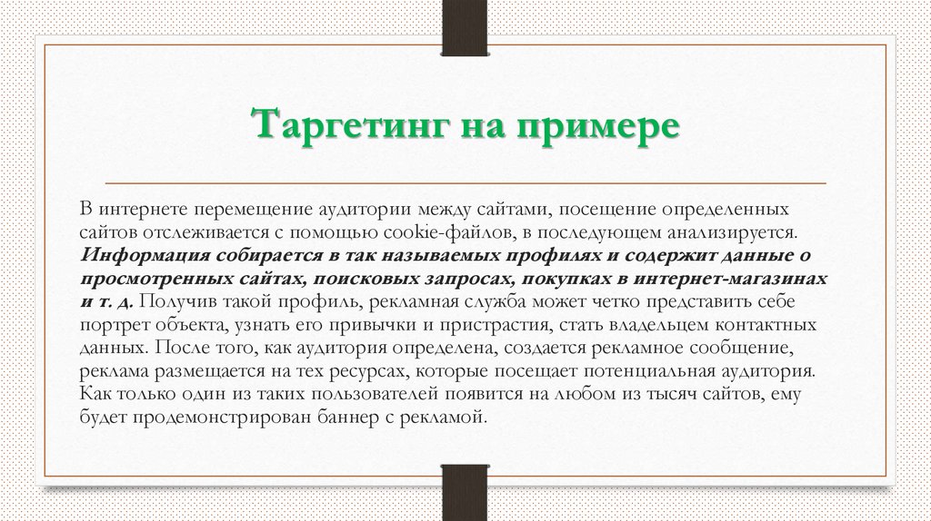 Таргетинг на примереВ интернете перемещение аудитории между сайтами, посещение определенных