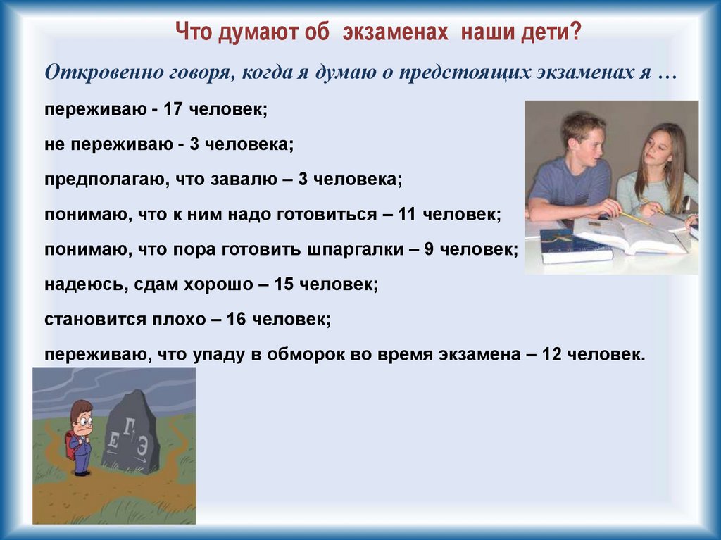 Что думают об экзаменах наши дети?Откровенно говоря, когда я думаю о предстоящих экзаменах я …