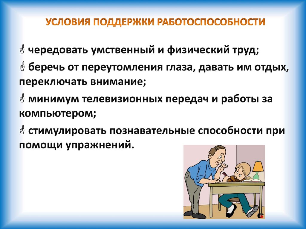 чередовать умственный и физический труд;беречь от переутомления глаза, давать им отдых,