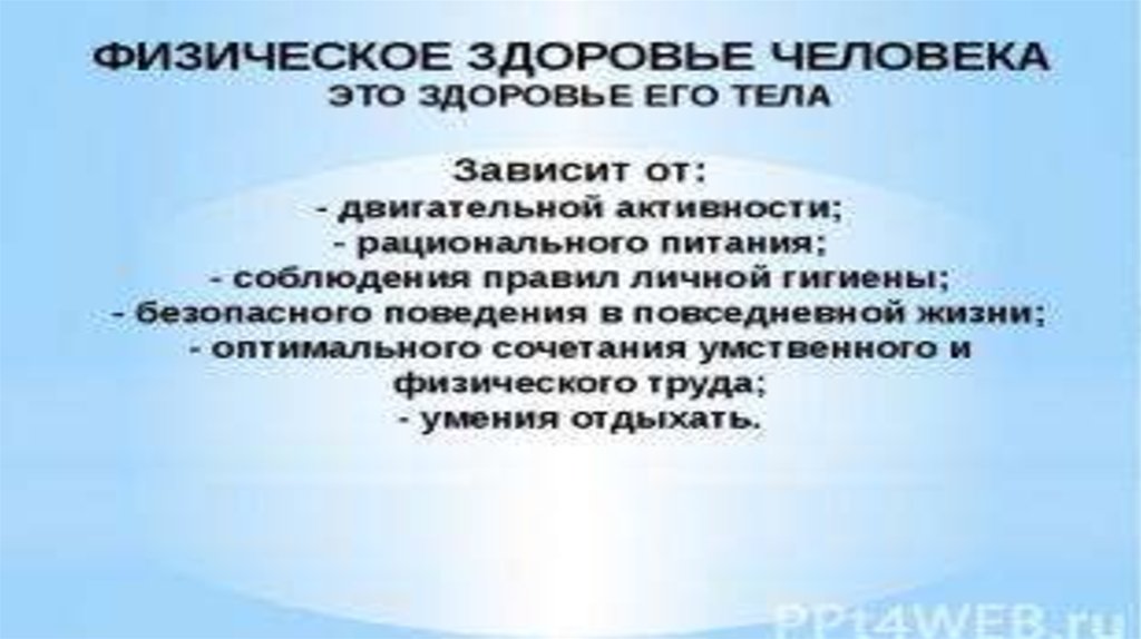 6. Физическое здоровье - отсутствие болезненных состояний и болезненных изменений в органах и системах организма.