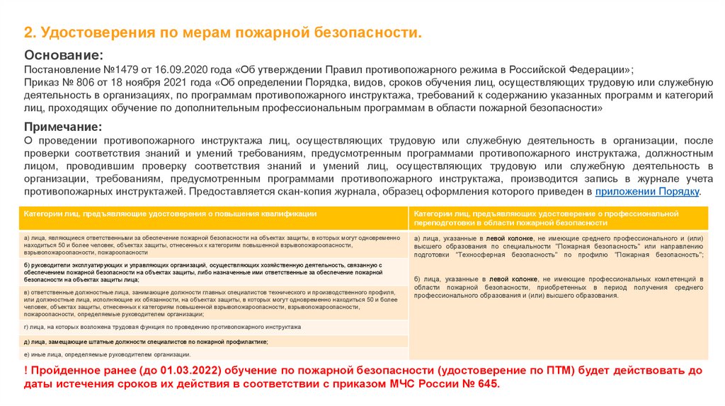 ! Пройденное ранее (до 01.03.2022) обучение по пожарной безопасности (удостоверение по ПТМ) будет действовать до
