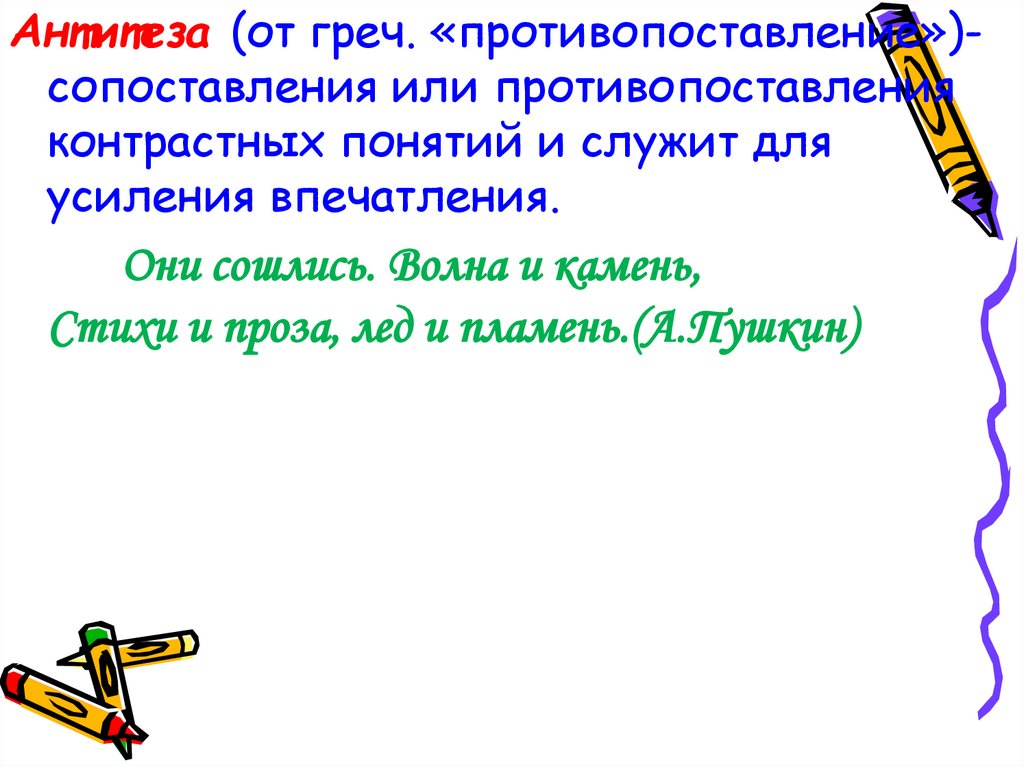 Антитеза (от греч. «противопоставление»)сопоставления или противопоставленияконтрастных понятий и служит для