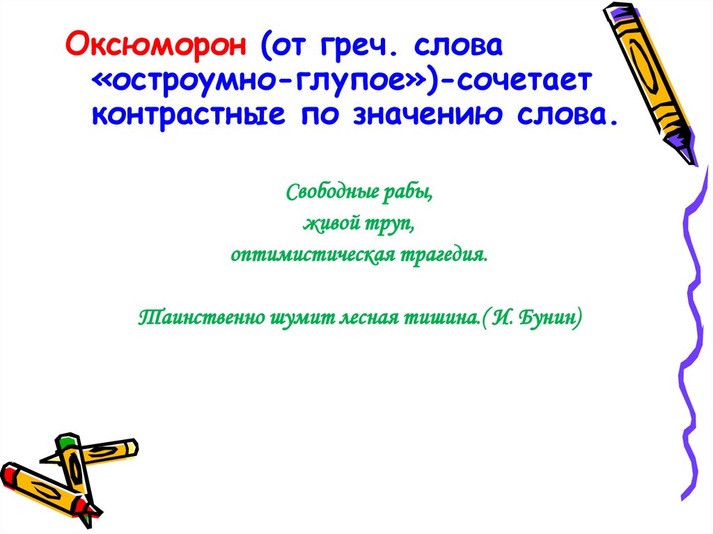 Оксюморон (от греч. слова«остроумно-глупое»)-сочетает
