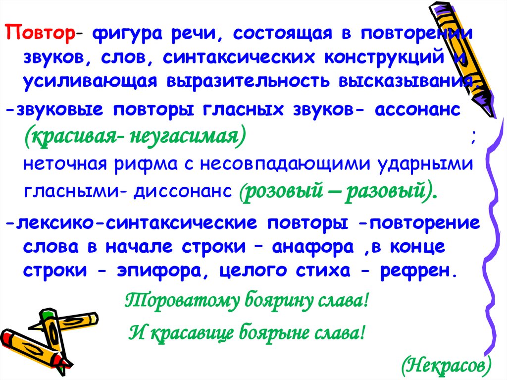 Повтор- фигура речи, состоящая в повторениизвуков, слов, синтаксических конструкций и