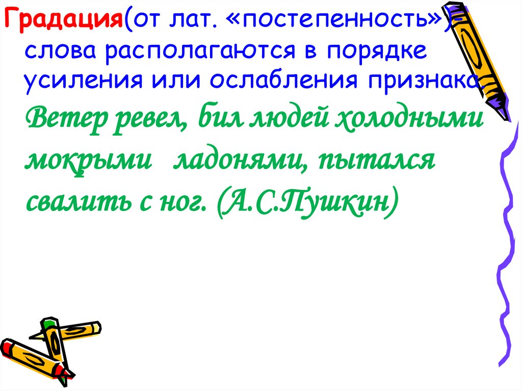 Градация(от лат. «постепенность»)слова располагаются в порядкеусиления или ослабления признака.
