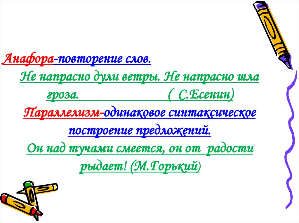 Анафора-повторение слов.Не напрасно дули ветры. Не напрасно шла