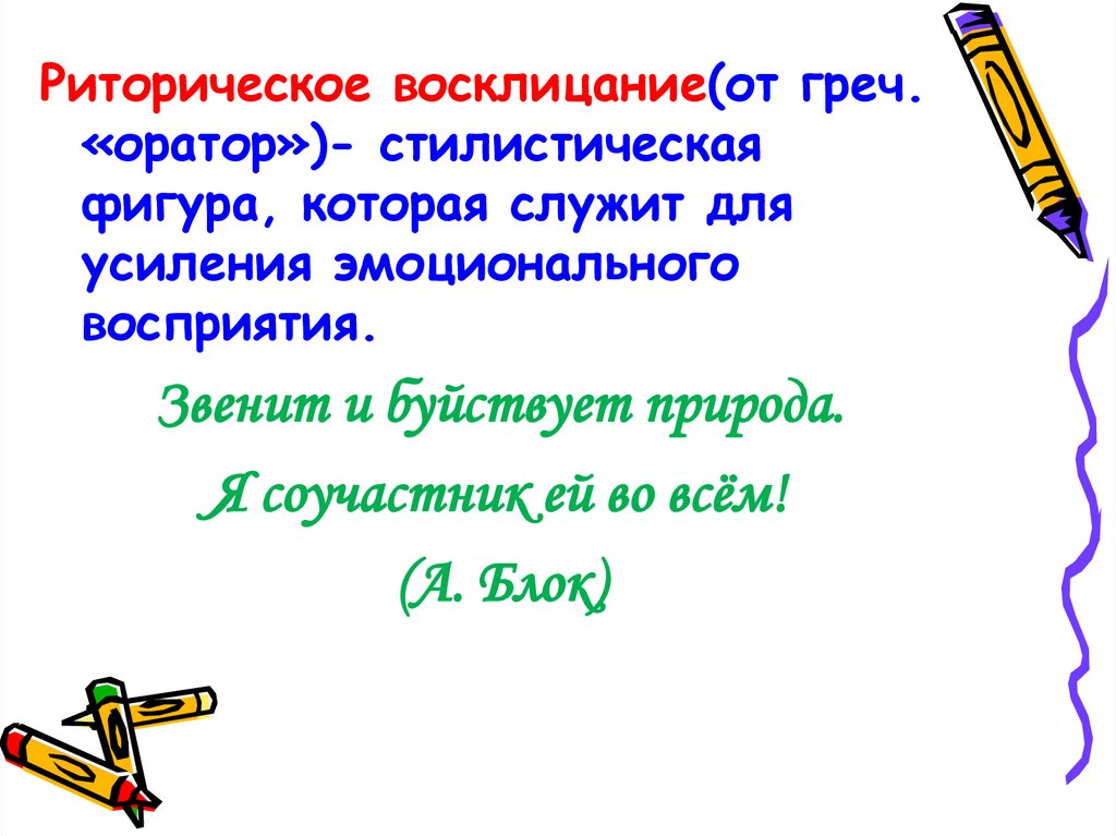 Риторическое восклицание(от греч.«оратор»)- стилистическая