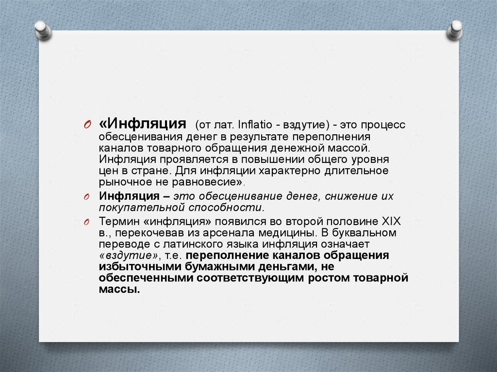 O «Инфляция (от лат. Inflatio - вздутие) - это процессобесценивания денег в результате переполнения
