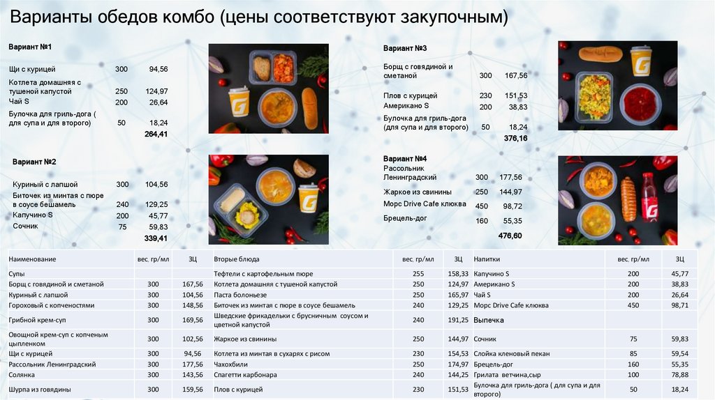 Варианты обедов комбо (цены соответствуют закупочным)Вариант №1