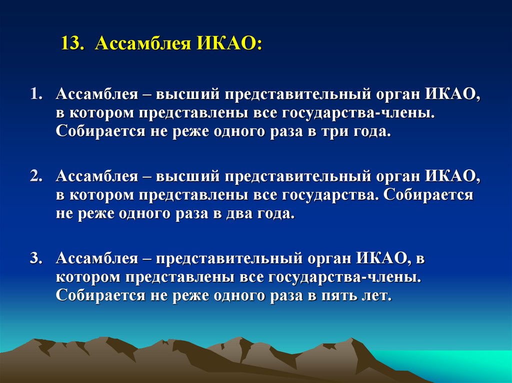13. Ассамблея ИКАО:1. Ассамблея – высший представительный орган ИКАО,