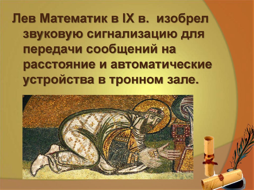 Лев Математик в IX в. изобрелзвуковую сигнализацию для