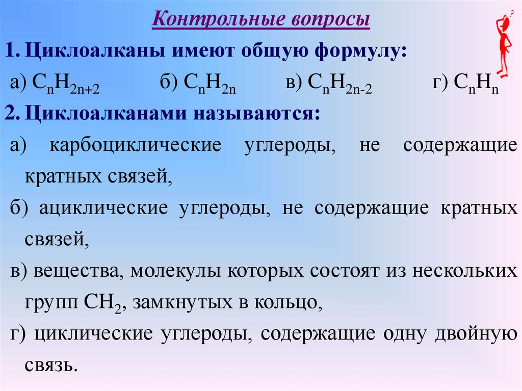 Контрольные вопросы1. Циклоалканы имеют общую формулу: