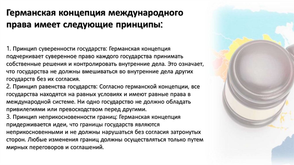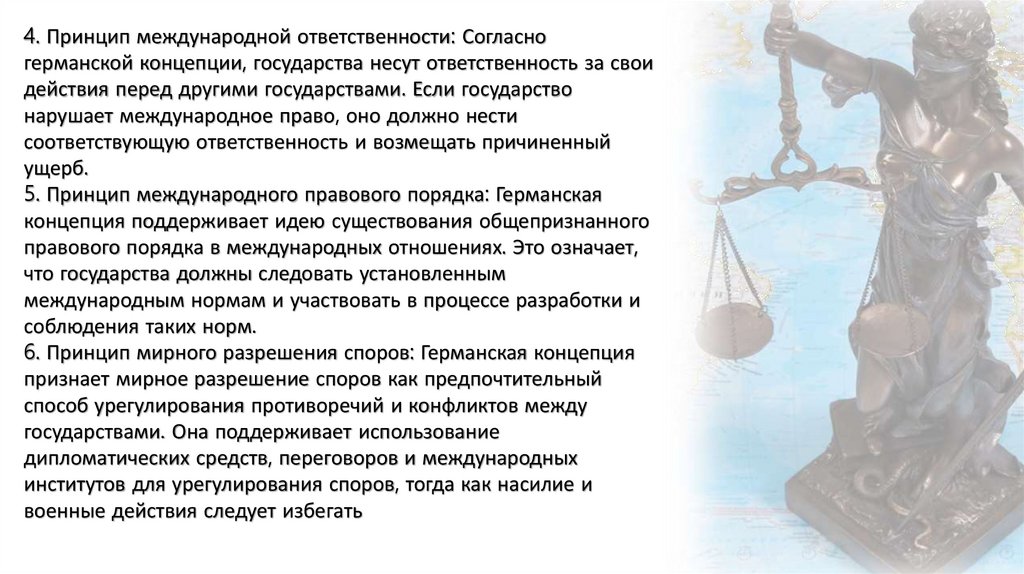 4. Принцип международной ответственности: Согласногерманской концепции, государства несут ответственность за свои