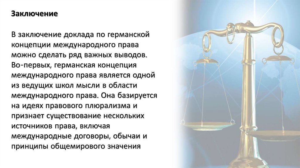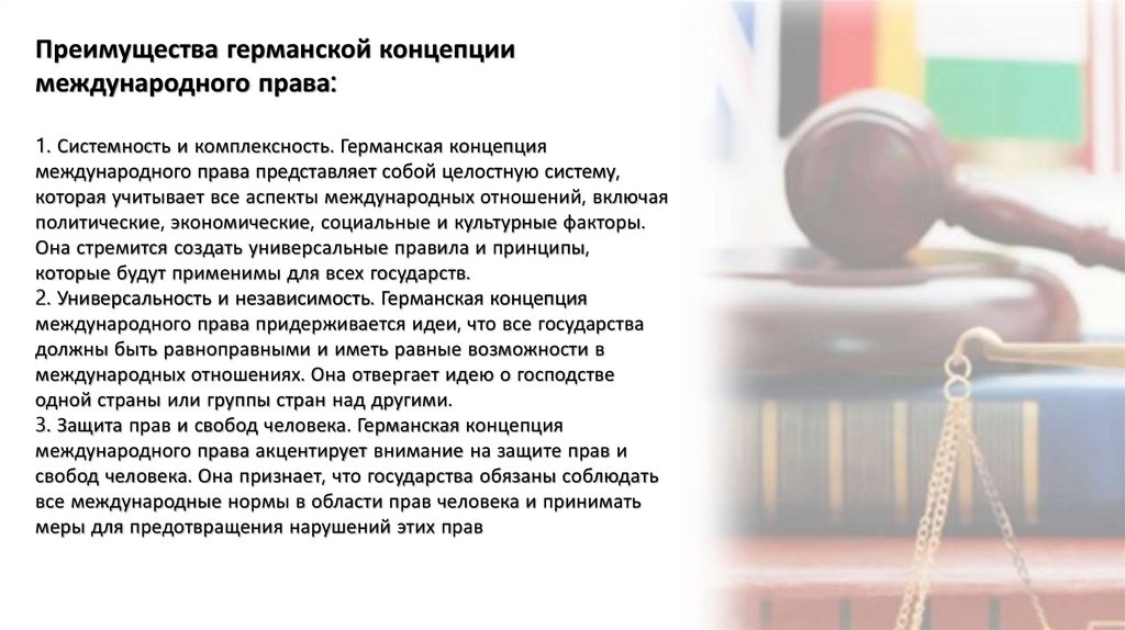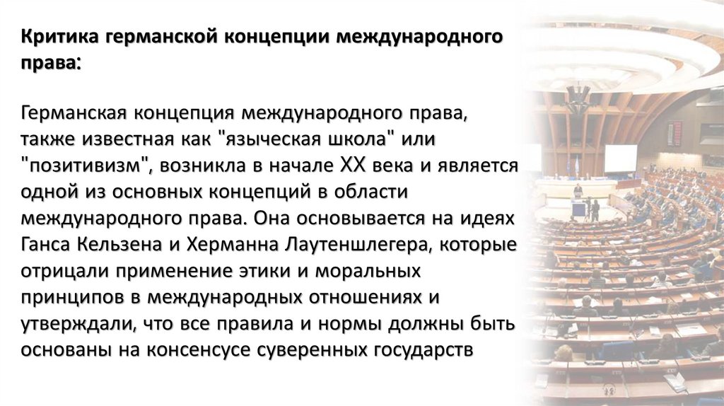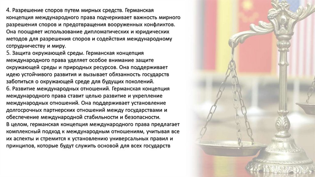 4. Разрешение споров путем мирных средств. Германскаяконцепция международного права подчеркивает важность мирного