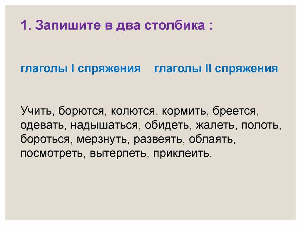 1. Запишите в два столбика :глаголы I спряжения