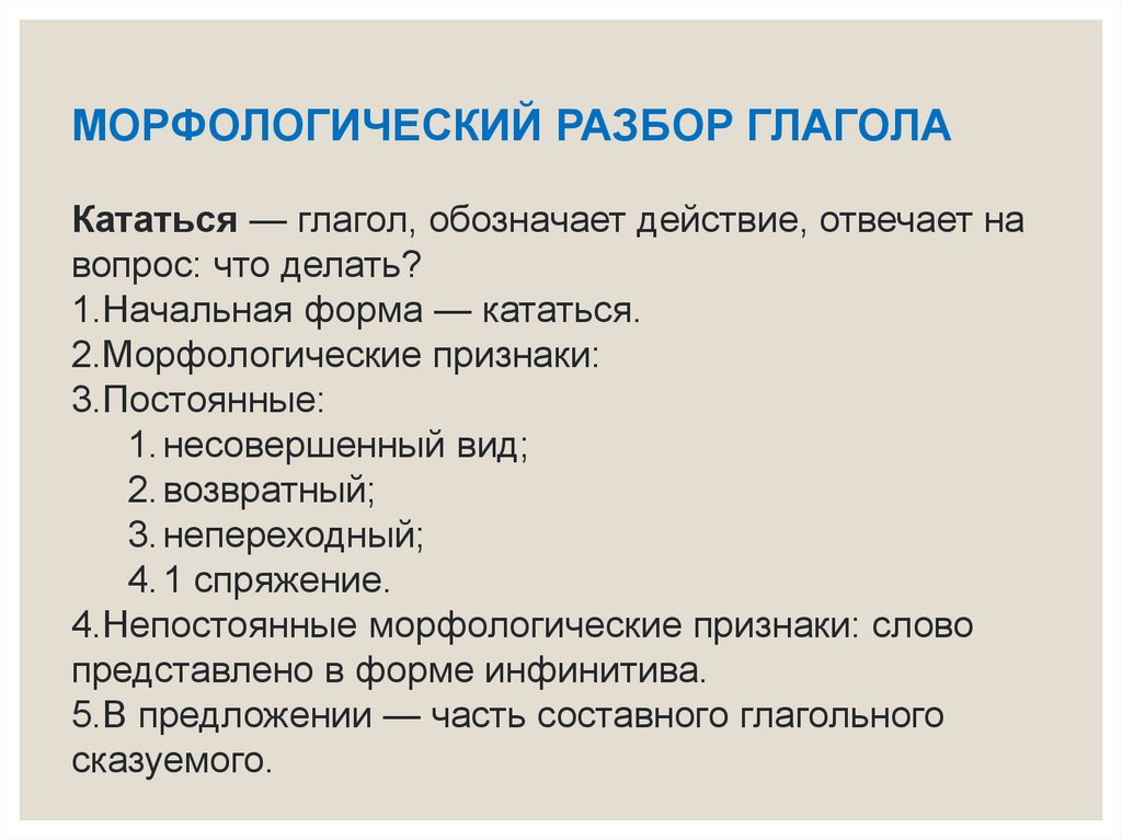 МОРФОЛОГИЧЕСКИЙ РАЗБОР ГЛАГОЛАКататься — глагол, обозначает действие, отвечает на