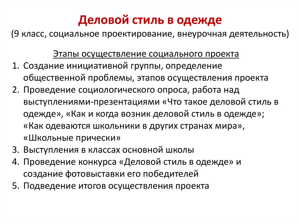 Деловой стиль в одежде(9 класс, социальное проектирование, внеурочная деятельность)