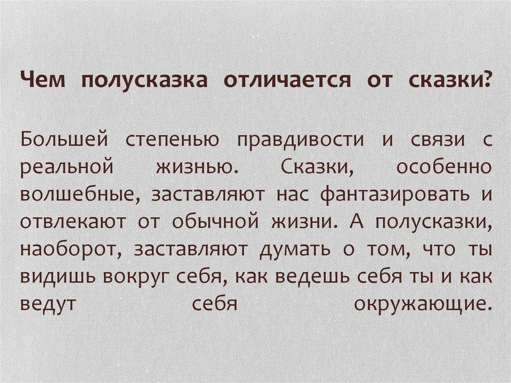 Чем полусказка отличается от сказки?Большей степенью правдивости и связи с