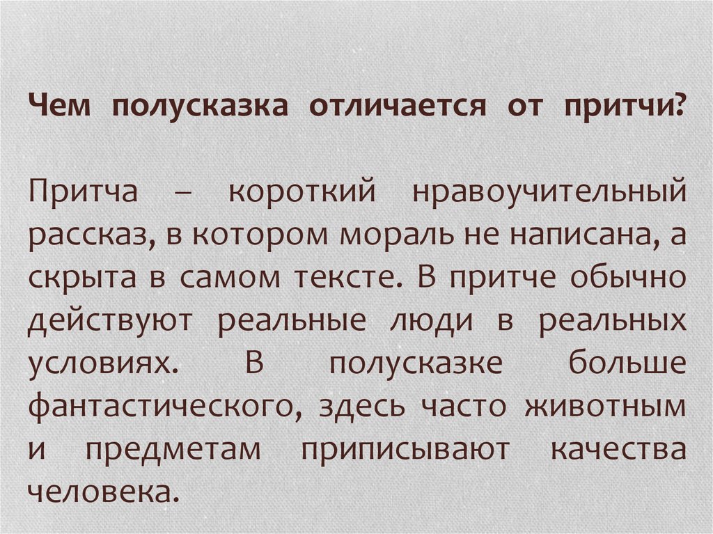 Чем полусказка отличается от притчи?Притча – короткий нравоучительный