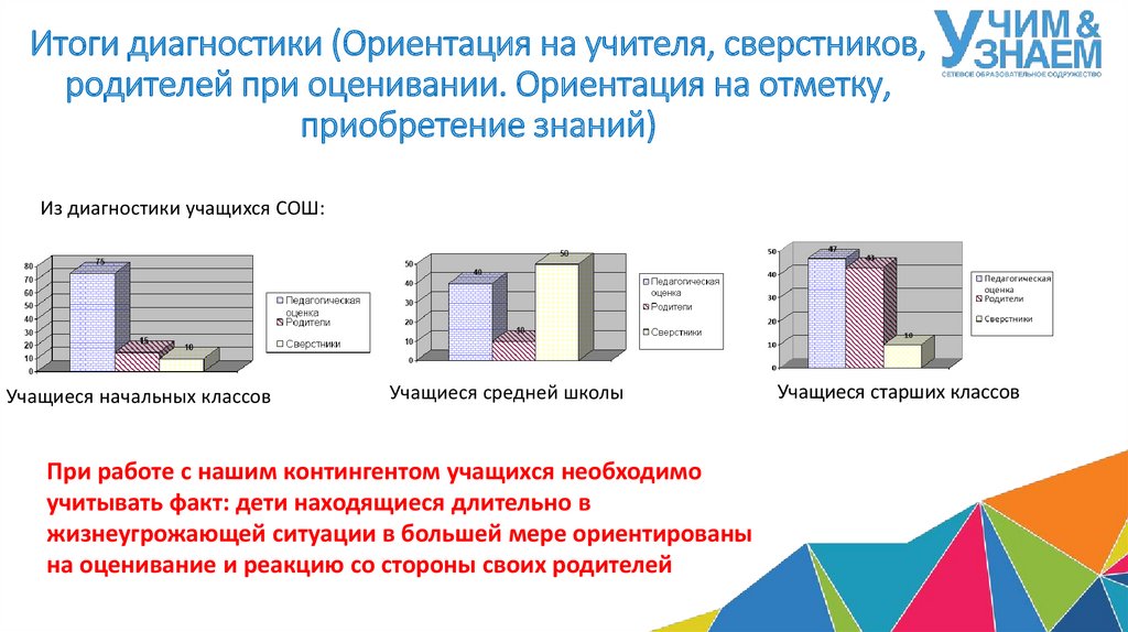Итоги диагностики (Ориентация на учителя, сверстников,родителей при оценивании. Ориентация на отметку,