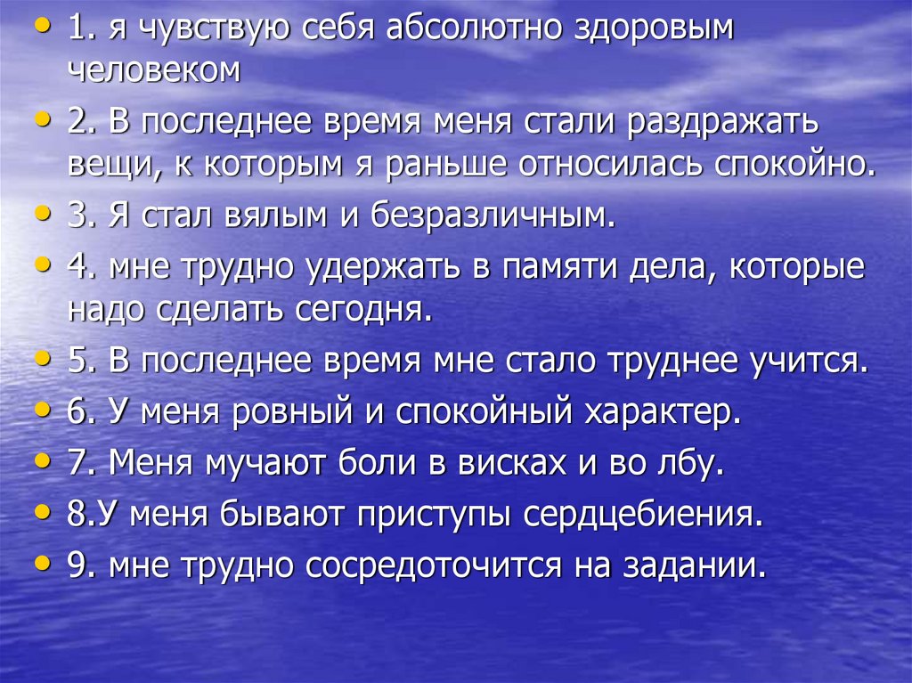 • 1. я чувствую себя абсолютно здоровымчеловеком