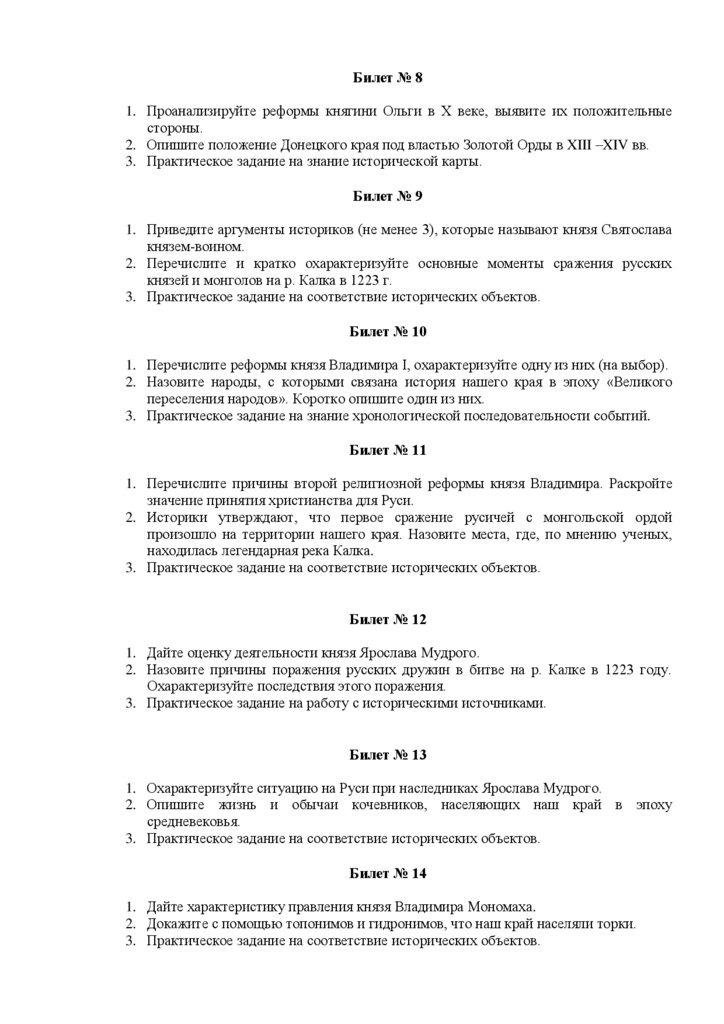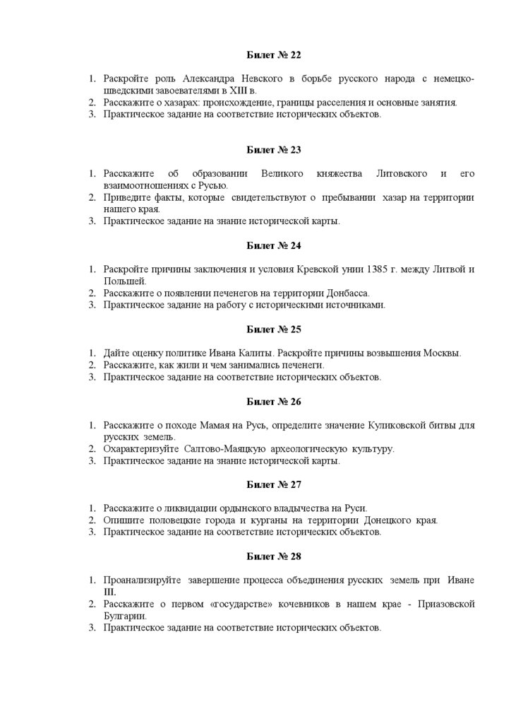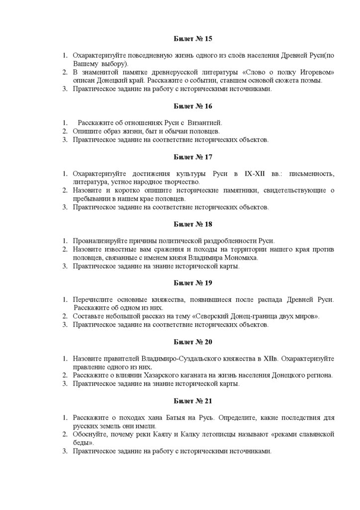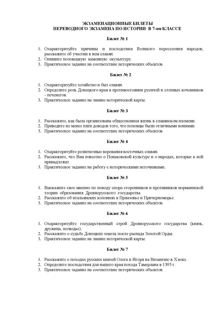 Экзаменационные билеты переводного экзамена по истории в 7-ом классе