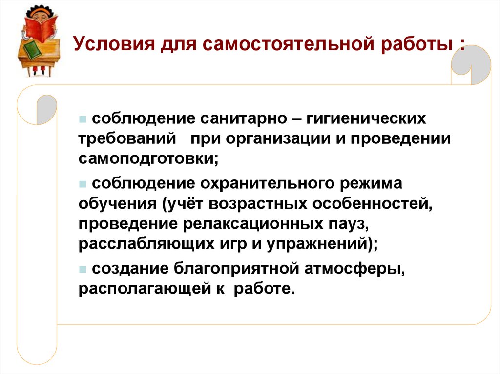 Условия для самостоятельной работы :соблюдение санитарно – гигиенических