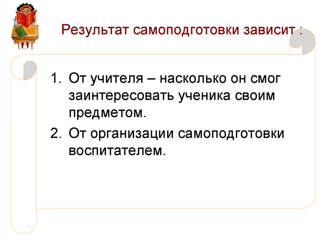 Результат самоподготовки зависит :1. От учителя – насколько он смог