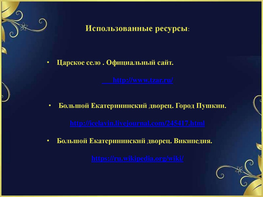 Использованные ресурсы:• Царское село . Официальный сайт.
