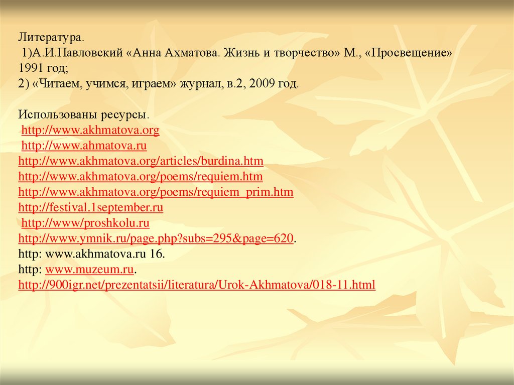 Литература.1)А.И.Павловский «Анна Ахматова. Жизнь и творчество» М., «Просвещение»