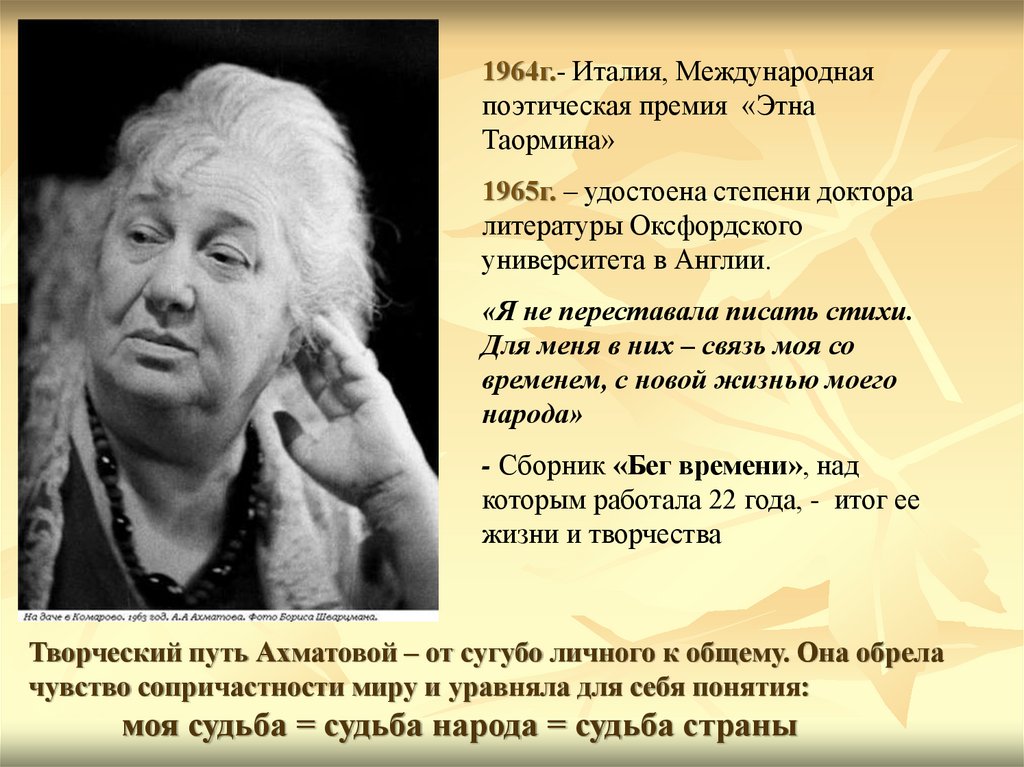 Творческий путь Ахматовой – от сугубо личного к общему. Она обрела